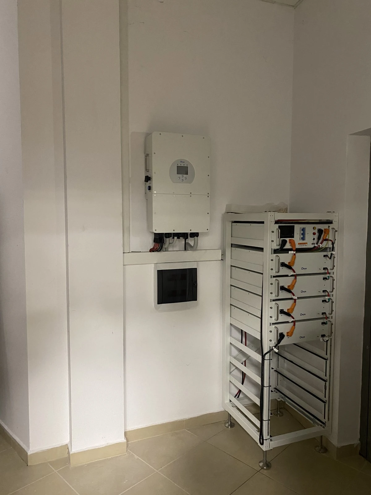 За постигане на тази цел използвахме хибриден инвертор Deye 20 kW, който позволява едновременно управление на енергията от соларните панели, батериите и електрическата мрежа. Инверторът осигурява автоматично превключване при спиране на тока, което гарантира непрекъсната работа на оборудването в обекта.